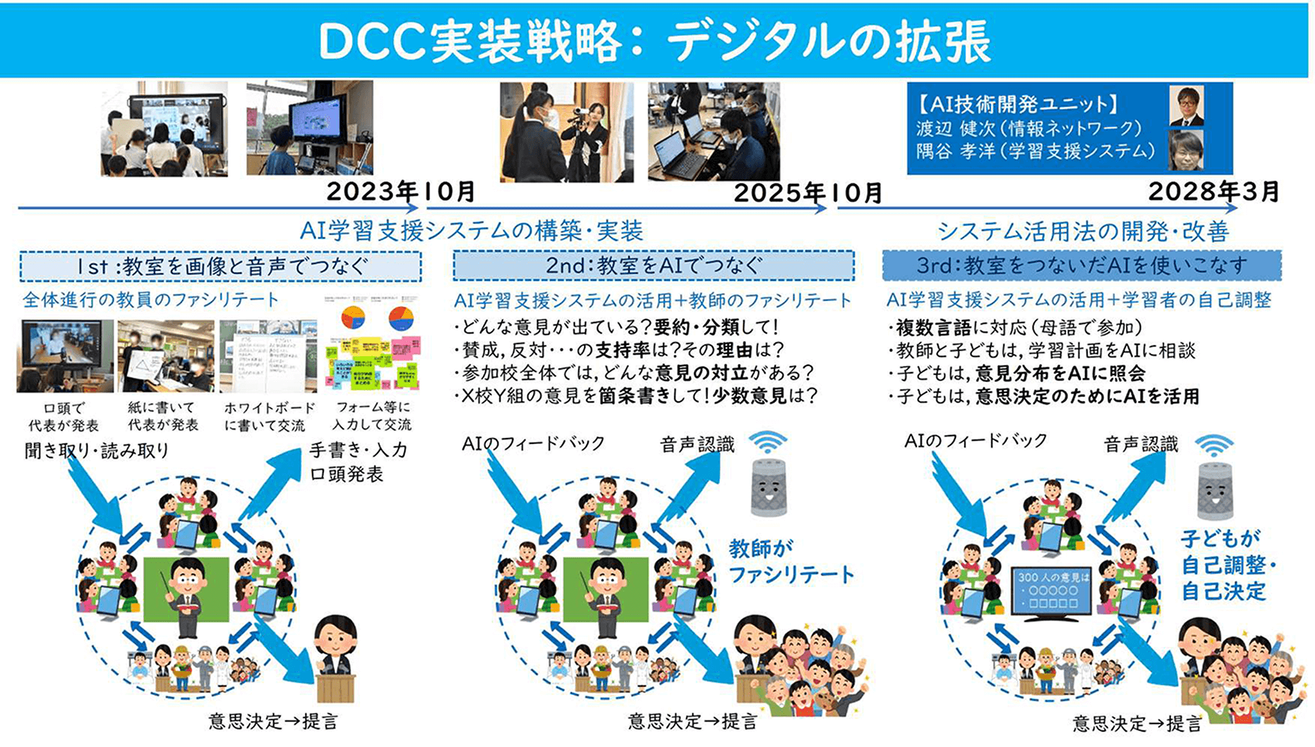 すなわち,➀公共的対話を実現する主題や教材,方法論を組み込んだカリキュラムの開発,➁様々な立場の市民(保護者・企業・行政・住民・不登校児童生徒等)が公共的対話に参画できる社会基盤の開発,➂離れた教室の意見を自動で分析・可視化し,公共的対話をサポートするAI学習支援プログラムの開発です。