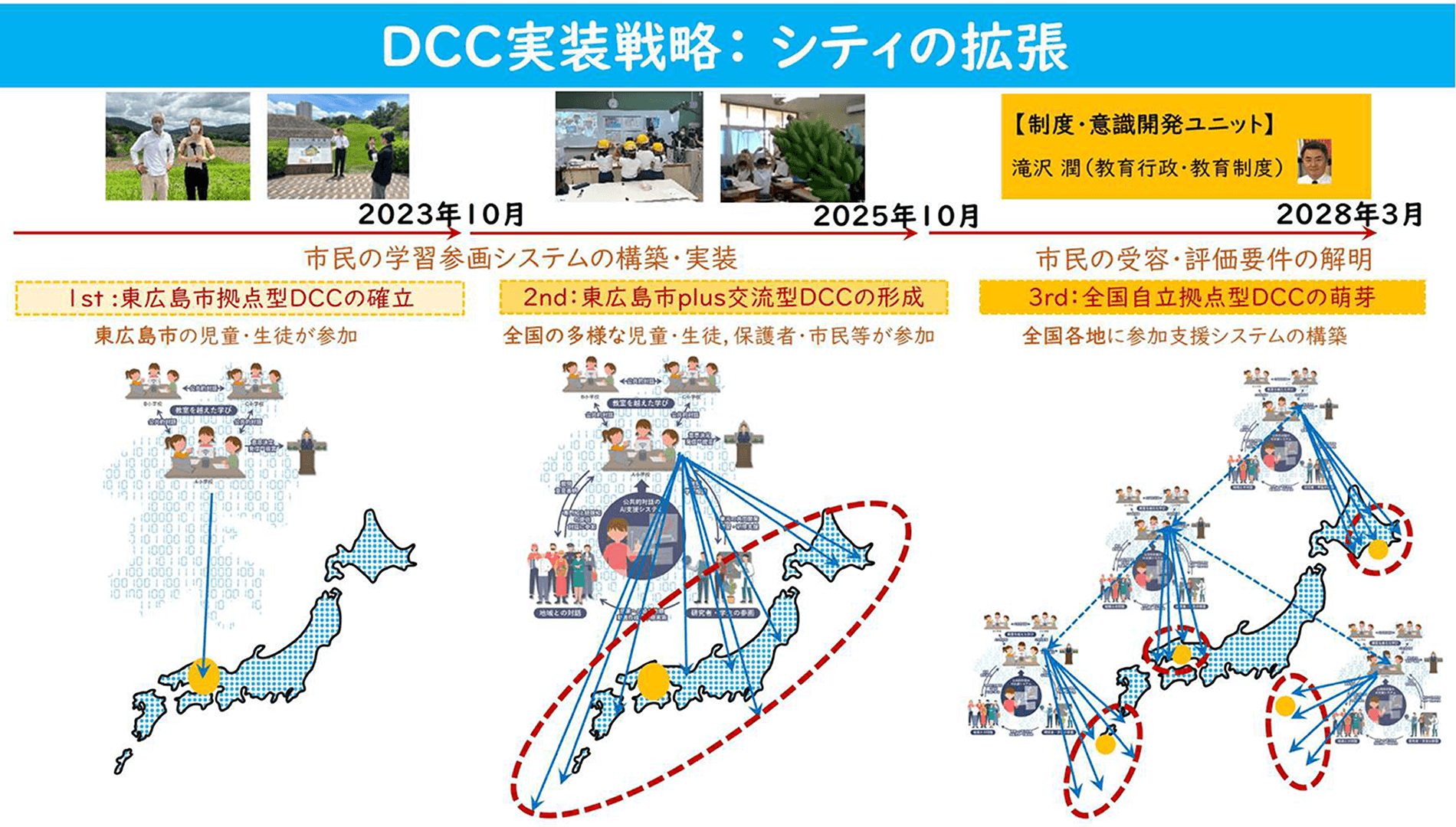 私たちは「規模の異なる学校の協働」「公共的課題の対話」「越境する教室空間」「デジタルによる柔軟な結合」「多様な市民の包摂」,これら5つの学びの姿を実現するネットワーク型の公教育空間=デジタル・シティズンシップ・シティ(DCC)の創出を目指しています。