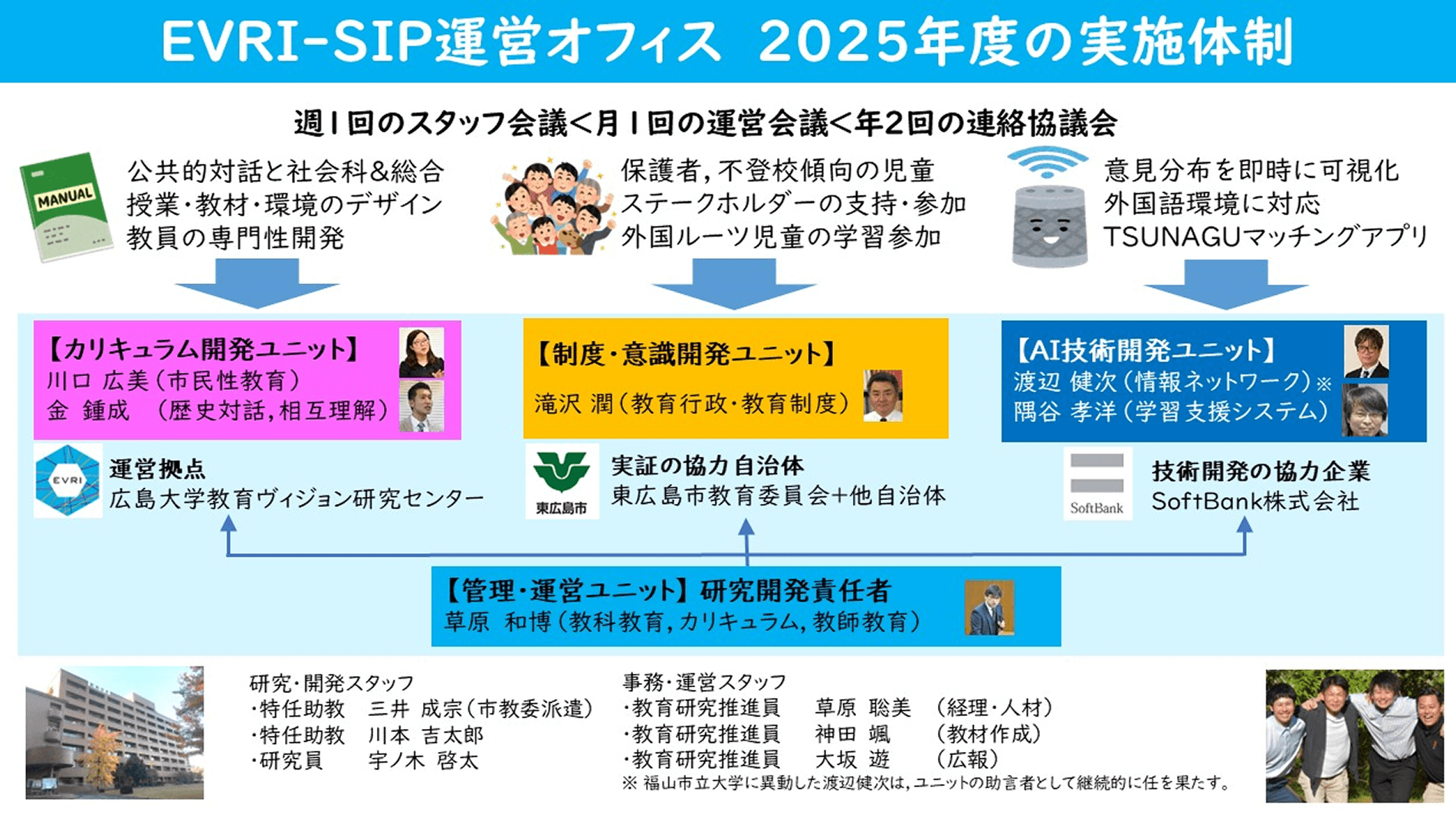 研究開発には,大学(広島大学EVRI),自治体(東広島市教育委員会),企業(SoftBank株式会社)の三者が連携してあたっています。三者は定期的に連絡協議会を開催し,成果や課題を共有しています。