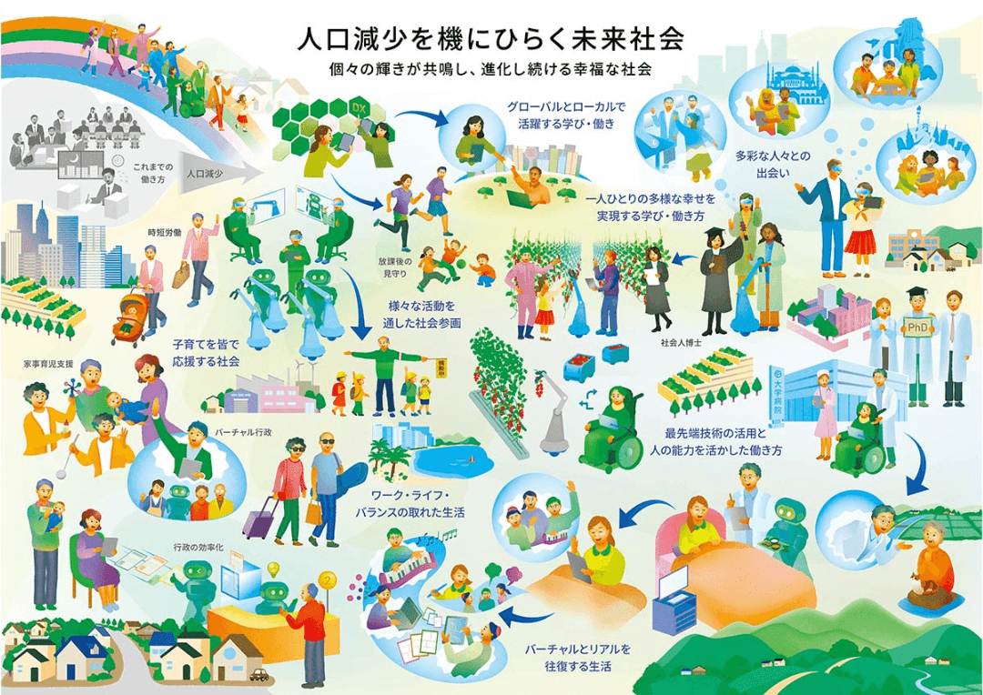 第5に,たとえ学校という場に集わなくても,様々な場から上の4つの学びに参加し,社会づくりに参画できるヴァーチャルなシステムを作ることです。