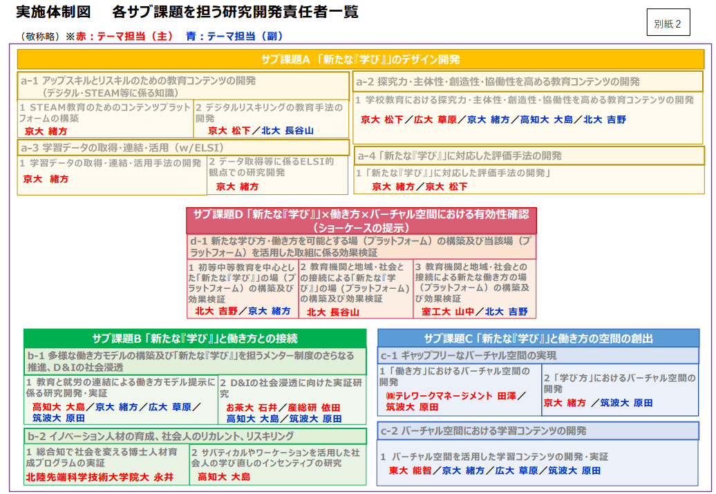SIP第3期は14の課題があり,このうち国立研究開発法人科学技術振興機構(JST)が2つの課題の研究推進法人として,研究開発テーマのマネジメントを実施する役割を担っています。その課題の1つが,「ポストコロナ時代の学び方・働き方を実現するプラットフォームの構築」です。EVRIのチームは,3つのサブ課題を担当しています(主はサブ課題A,副としてサブ課題B・Cを担当)。