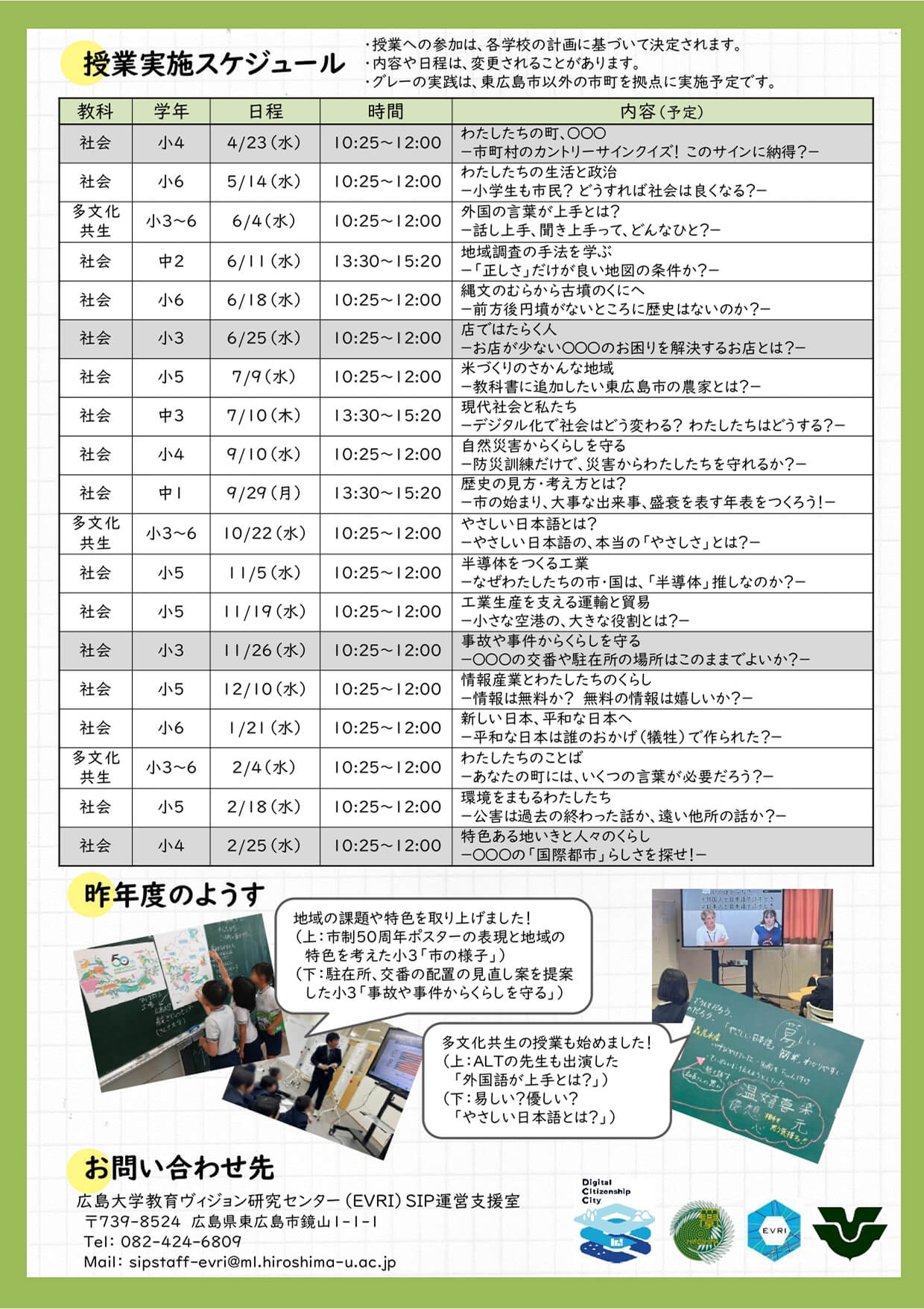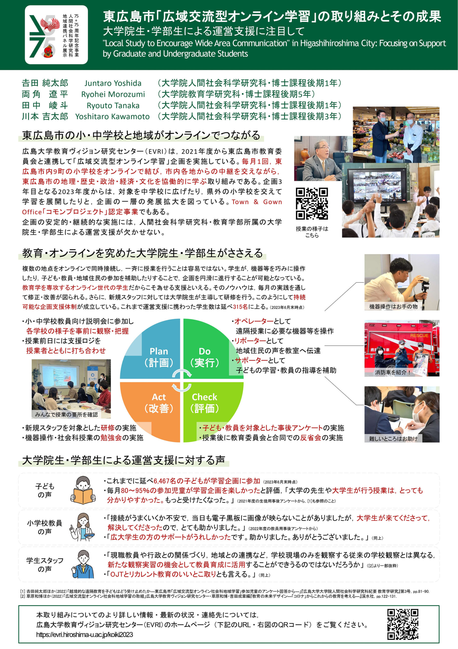 広島大学教育ヴィジョン研究センター(EVRI)が2021年度から展開する,東広島市教育委員会と連携した学習プログラムです(プロジェクト代表者:草原和博)。GIGAスクール構想の推進によって実現した子どもたちの「1人1台」端末と学校のICT環境を活用して,市内各地からの中継を交えながら,東広島市の地理・歴史・政治・経済・文化などについて対話的・双方向的に学びます。さらに,この学びを広島大学の教員と大学院生がコーディネートします。2023年度からは対象を中学校にも拡大して実施しています。