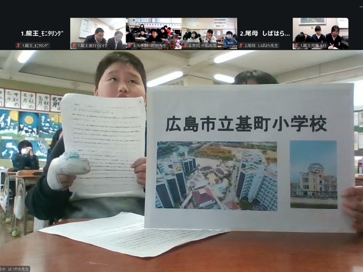 2025年12月12日、広島県の東広島市立龍王小学校・広島市立基町小学校、北海道の奥尻町立奥尻小学校、熊本県の南阿蘇村立久木野小学校、鹿児島県の徳之島町立尾母小学校の全5校・小学校5~6年生の計58名が参加し、広域交流型オンライン平和学習を実施しました。本授業は、各学校の平和学習の成果をオンラインで発表・交流することを通して、全国の平和学習の内容を比較し、共通する特徴を理解することを目的として実施されました。