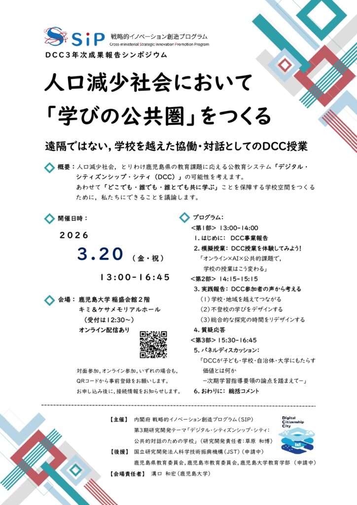 【イベント案内】【オンライン授業の体験も!】3年次報告会「人口減少社会において「学びの公共圏」をつくる~遠隔ではない、学校を越えた協働・対話としてのDCC授業~」を開催します(2026.03.20開催)