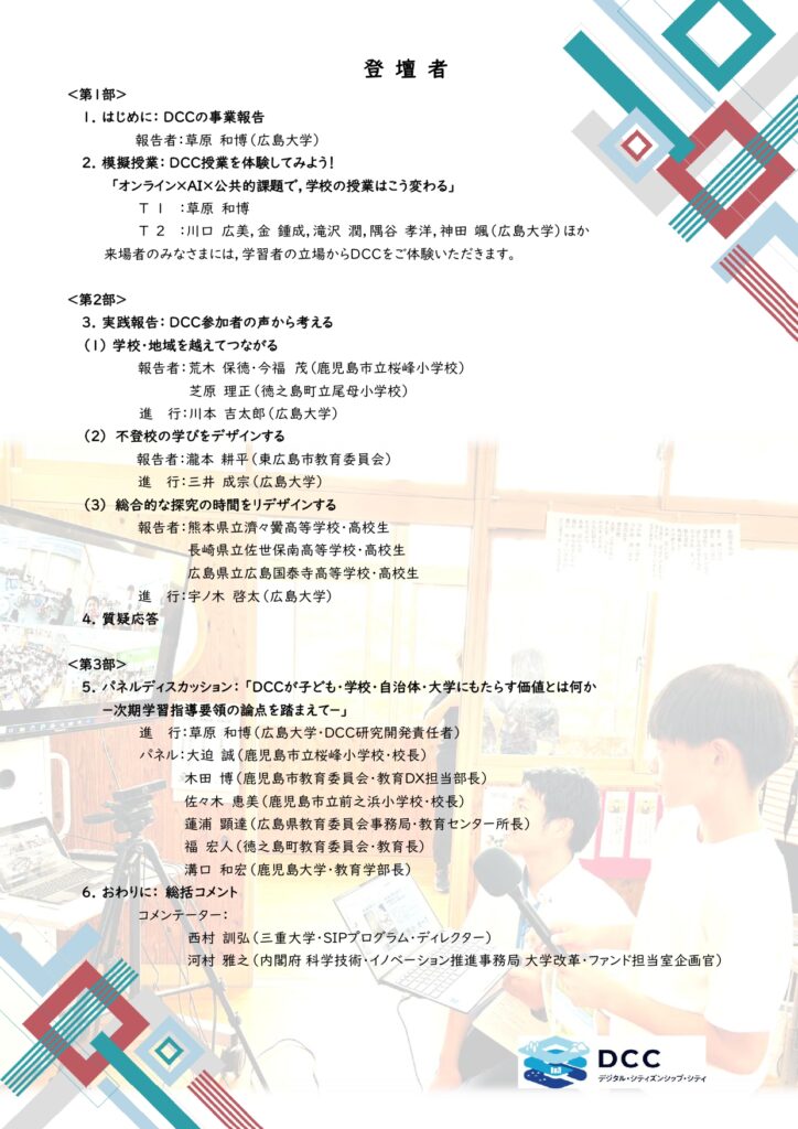 本報告会では、第3年次の鹿児島県を中心とした研究・実践・実装の成果を報告するとともに、次期学習指導要領の主要な論点等を踏まえたDCCの教育的・社会的な意義と可能性、そして将来構想について、主に鹿児島県内の学校教育関係者を招いて意見交換します。